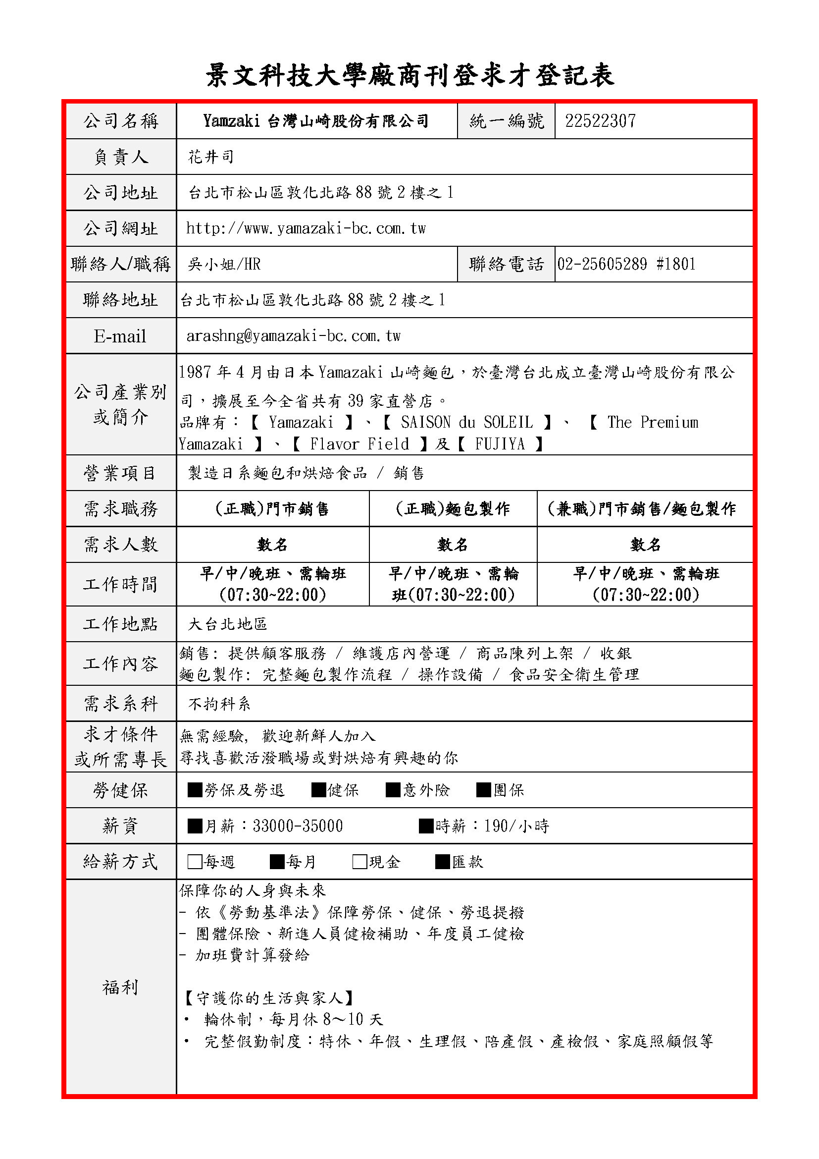 景文科大廠商求才登記表(職缺-Yamazaki_台灣山崎股份有限公司114年10月17日刊登_.pdf