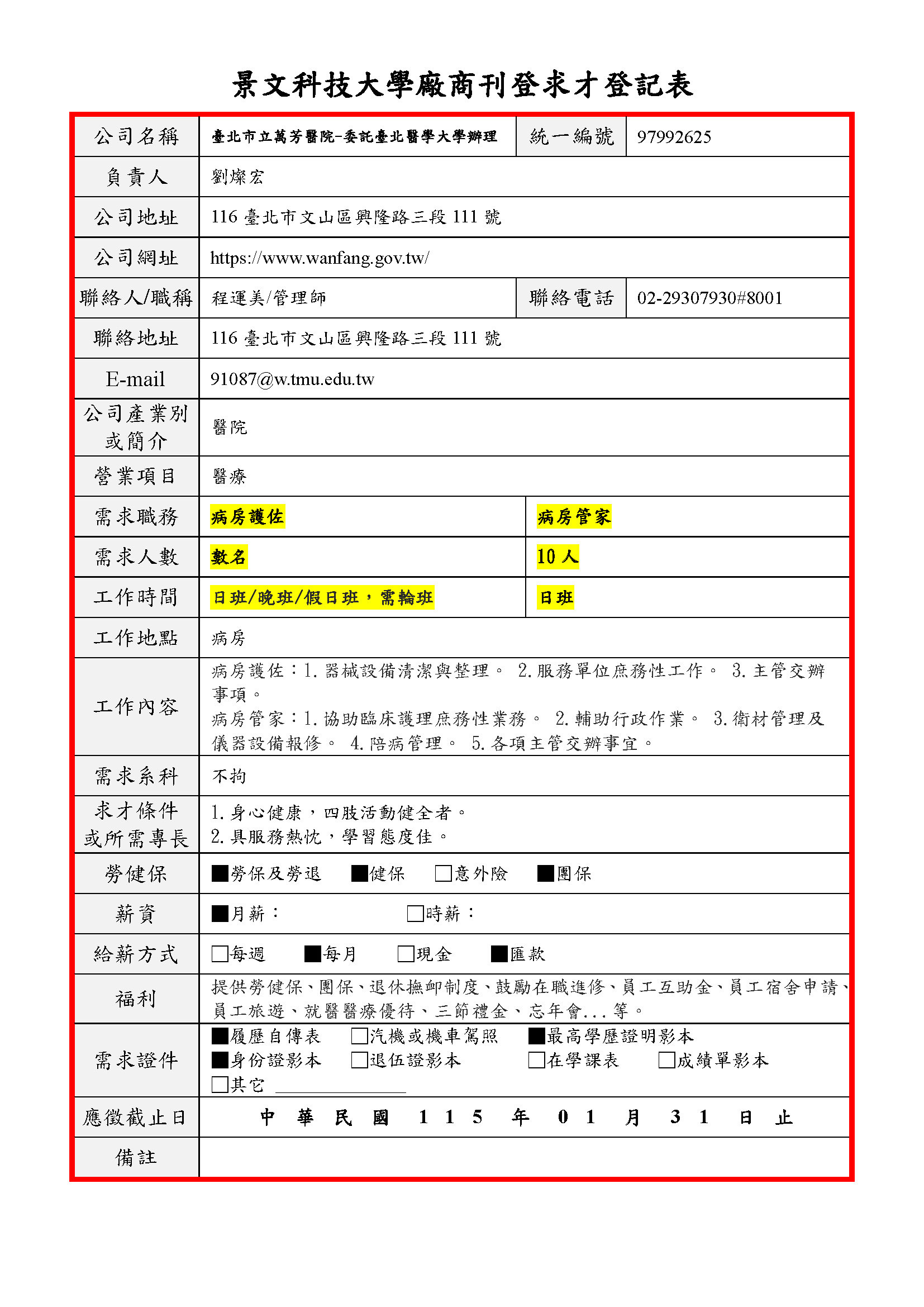 【臺北市立萬芳醫院-委託臺北醫學大學辦理】徵才訊息-病房護佐、病房管家