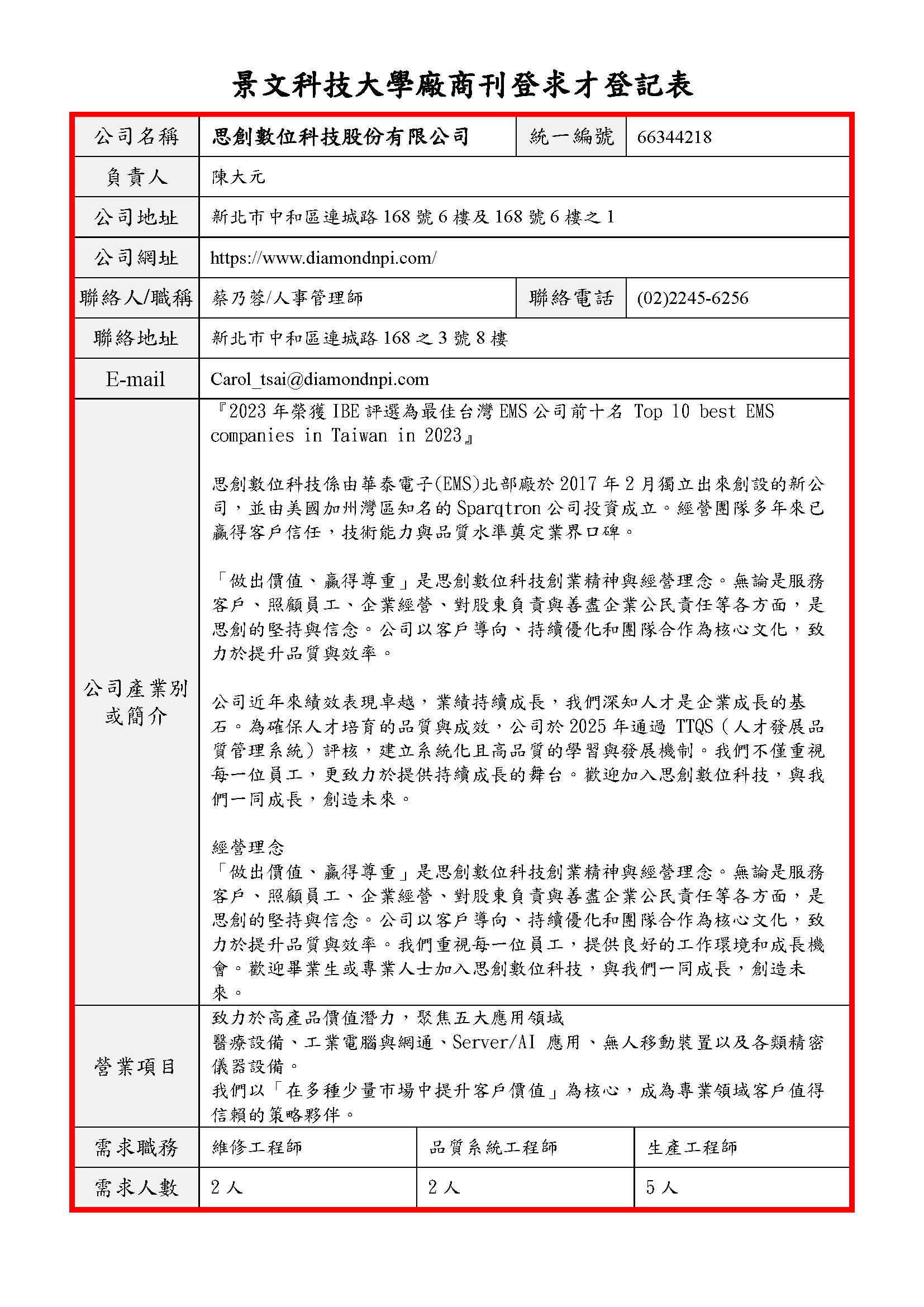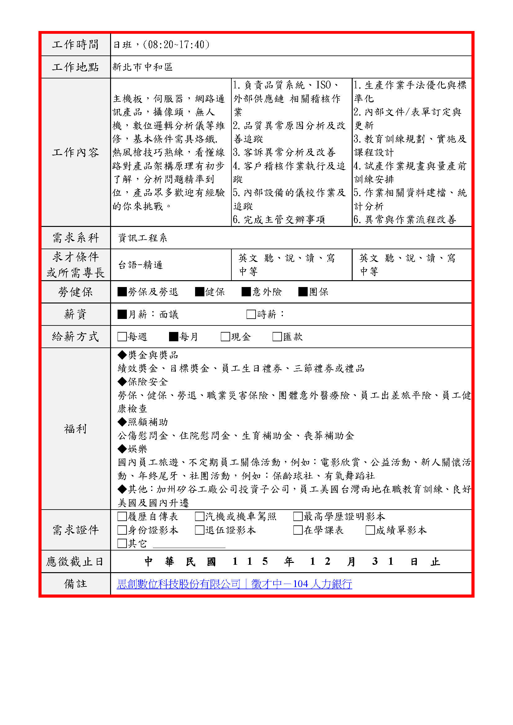 【思創數位科技股份有限公司】徵才資訊-維修工程師、品質系統工程師、生產工程師