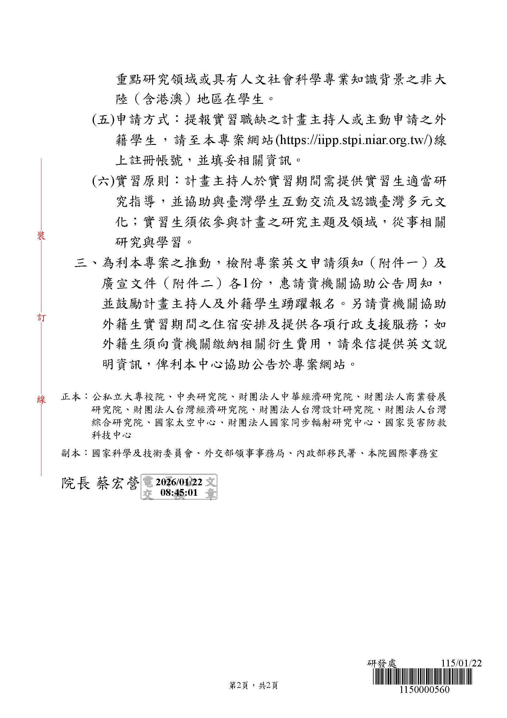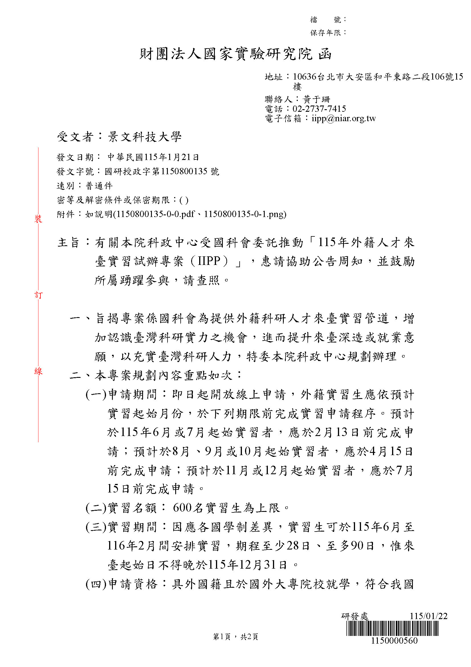 一、依據財團法人國家實驗研究院115年1月21日(國研授政字第1150800135 號)來函辦理。