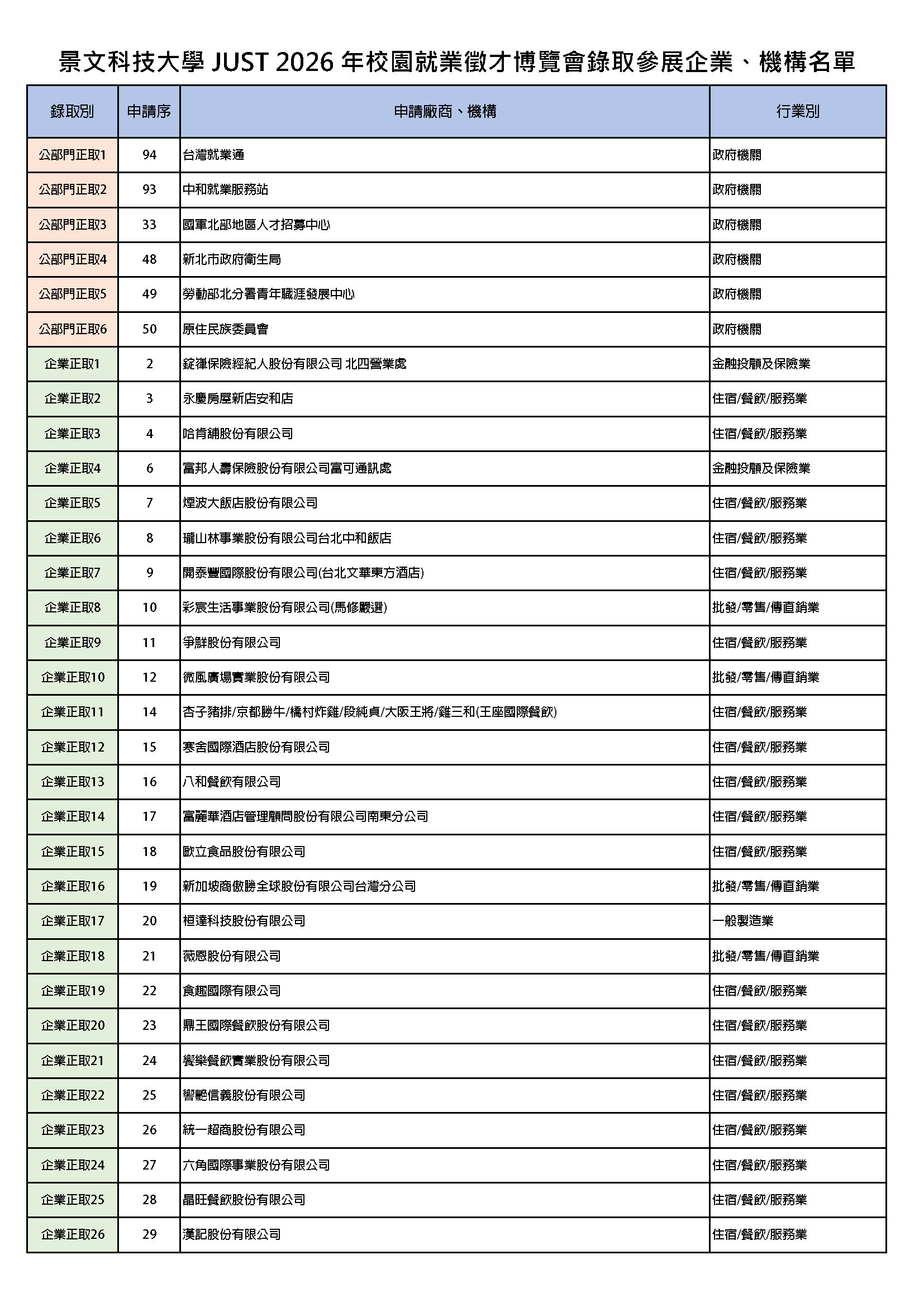 景文科技大學 JUST 2026 年校園就業徵才博覽會錄取參展企業、機構名單