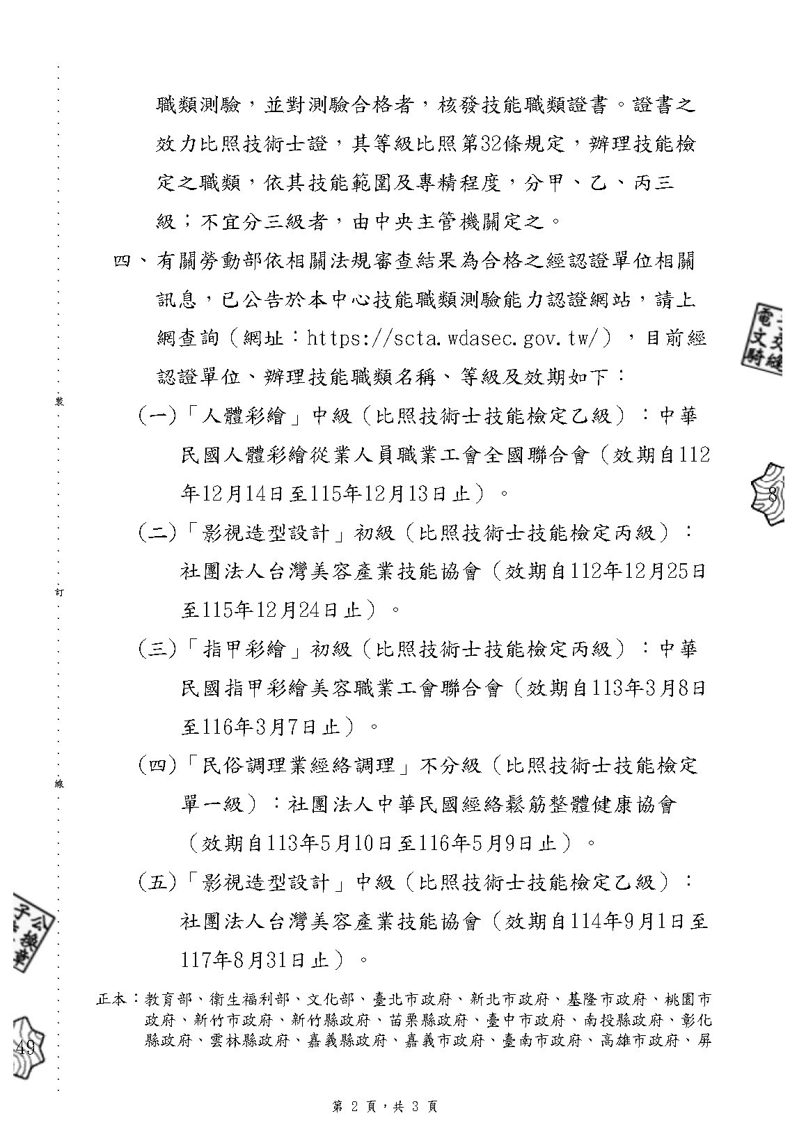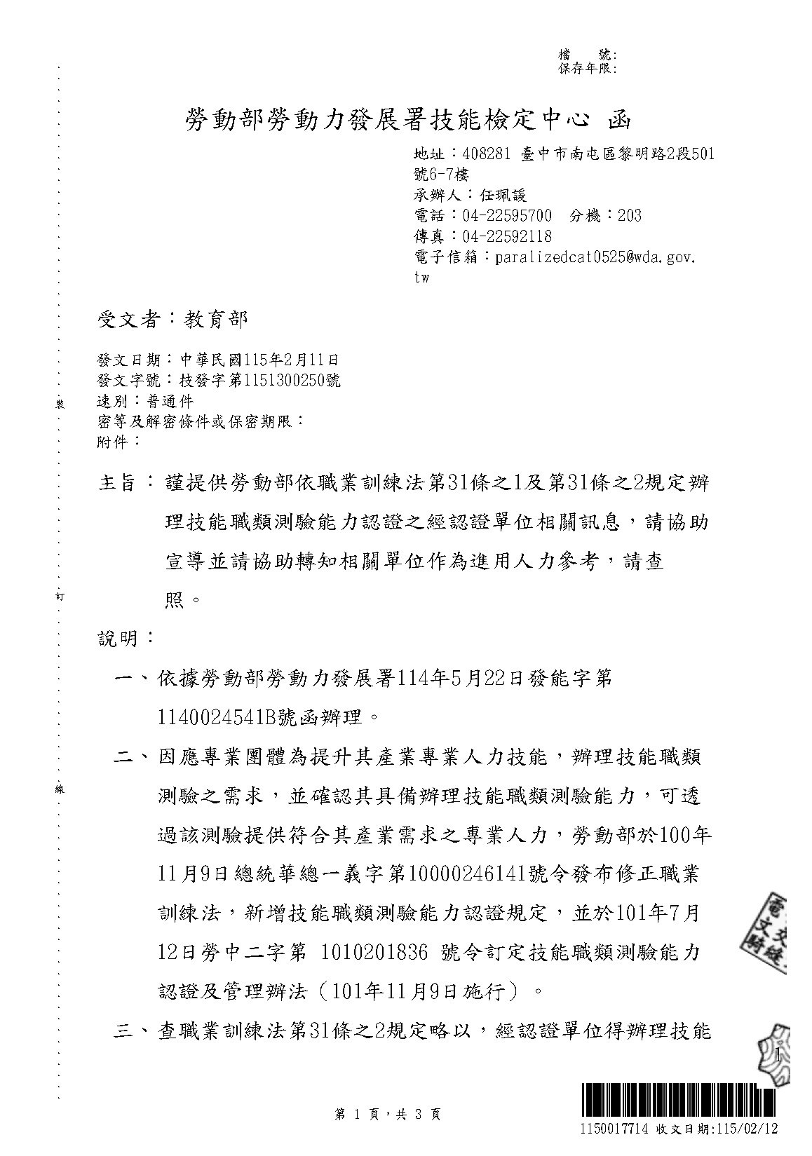 【勞動部勞動力發展署技能檢定中心】公告其勞動部依職業訓練法第31條之1及第31條之2規定辦理技能職類測驗能力認證之經認證單位相關訊息相關訊息。