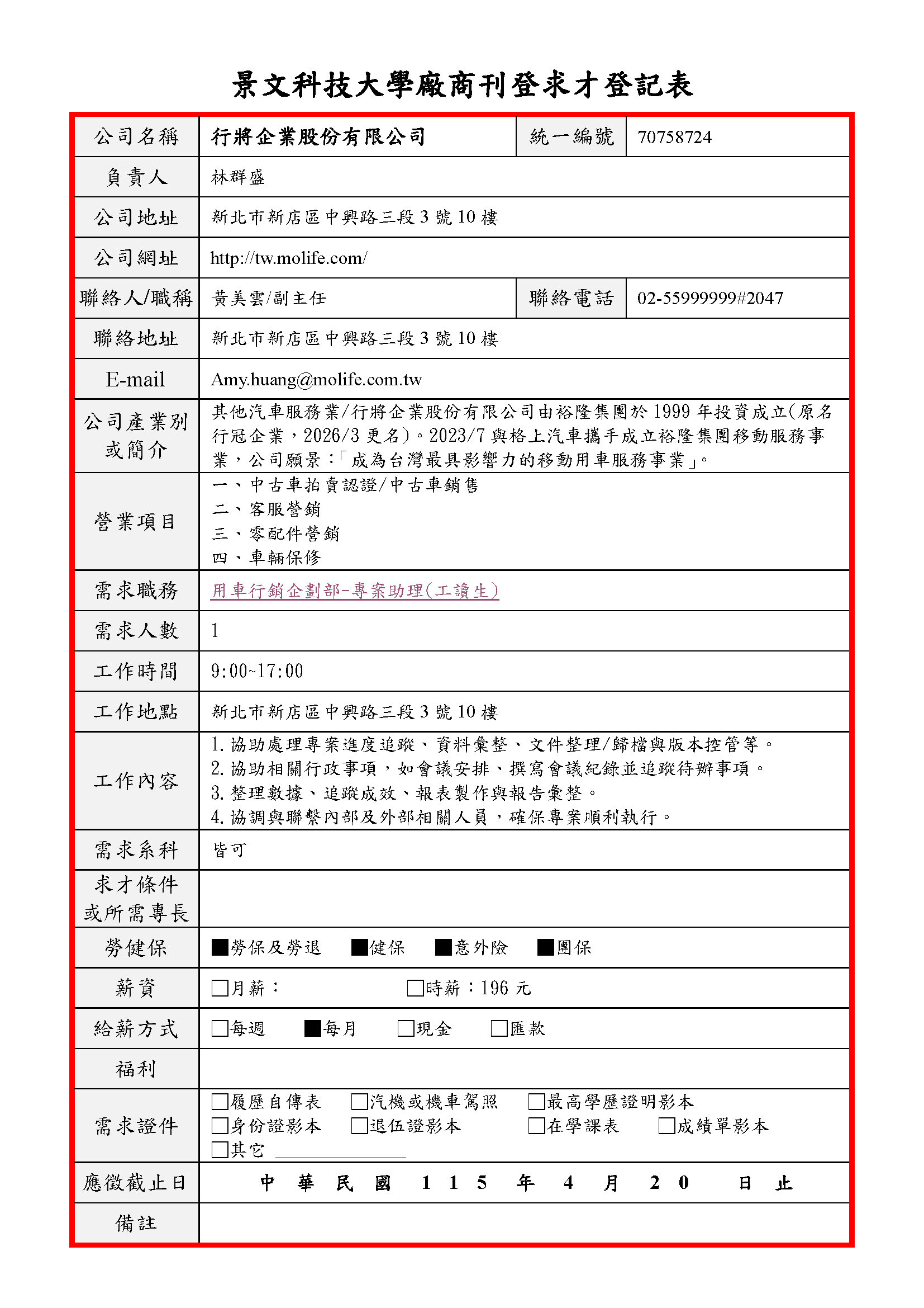【行將企業股份有限公司】徵-用車行銷企劃部-專案助理(工讀生)