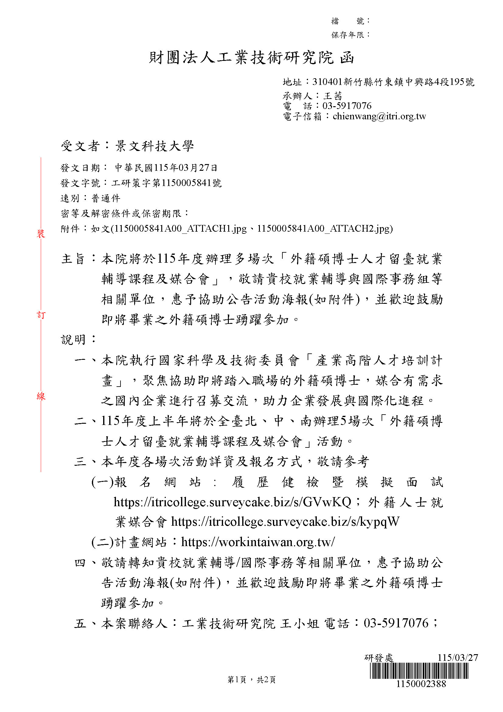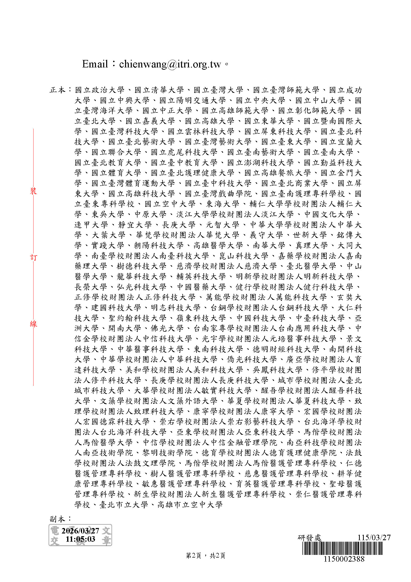 一、依據財團法人工業技術研究院115年03月27日(工研策字第1150005841號)來函辦理。