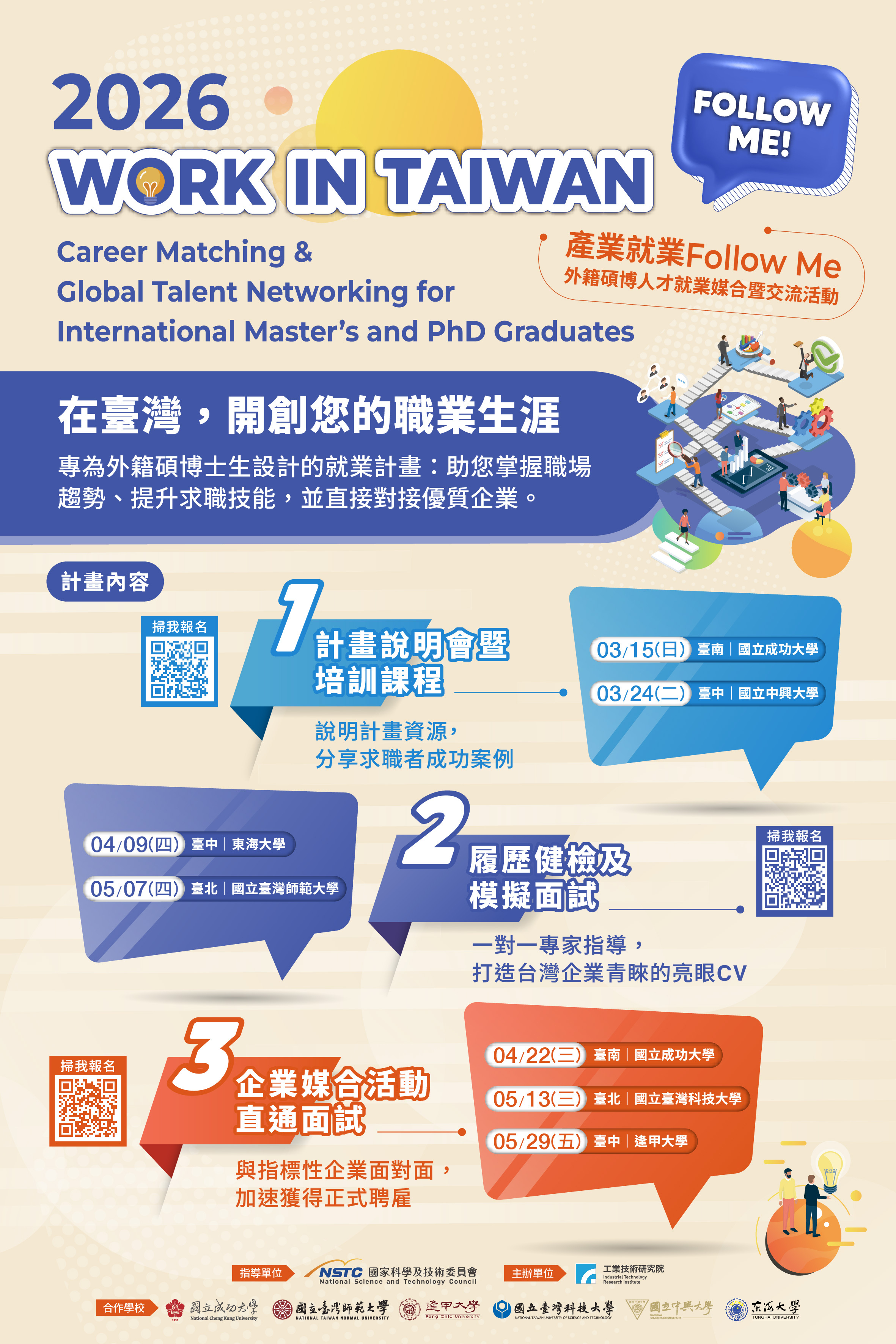 【財團法人工業技術研究院】公告其辦理多場次「外籍碩博士人才留臺就業輔導課程及媒合會」相關訊息。
