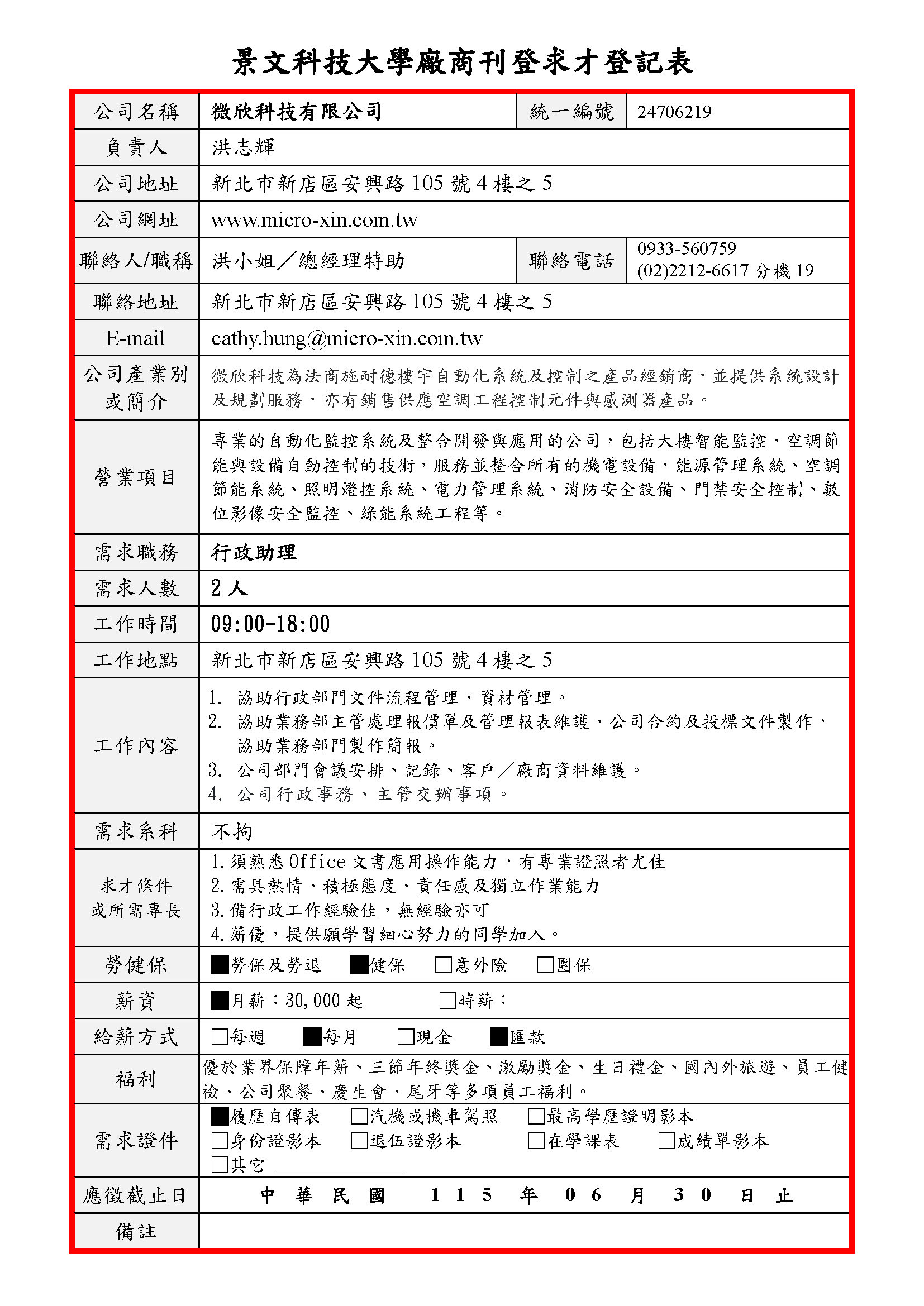 景文科大廠商求才登記表(行政助理-微欣科技有限公司)115年04月22日刊登_1150422.pdf