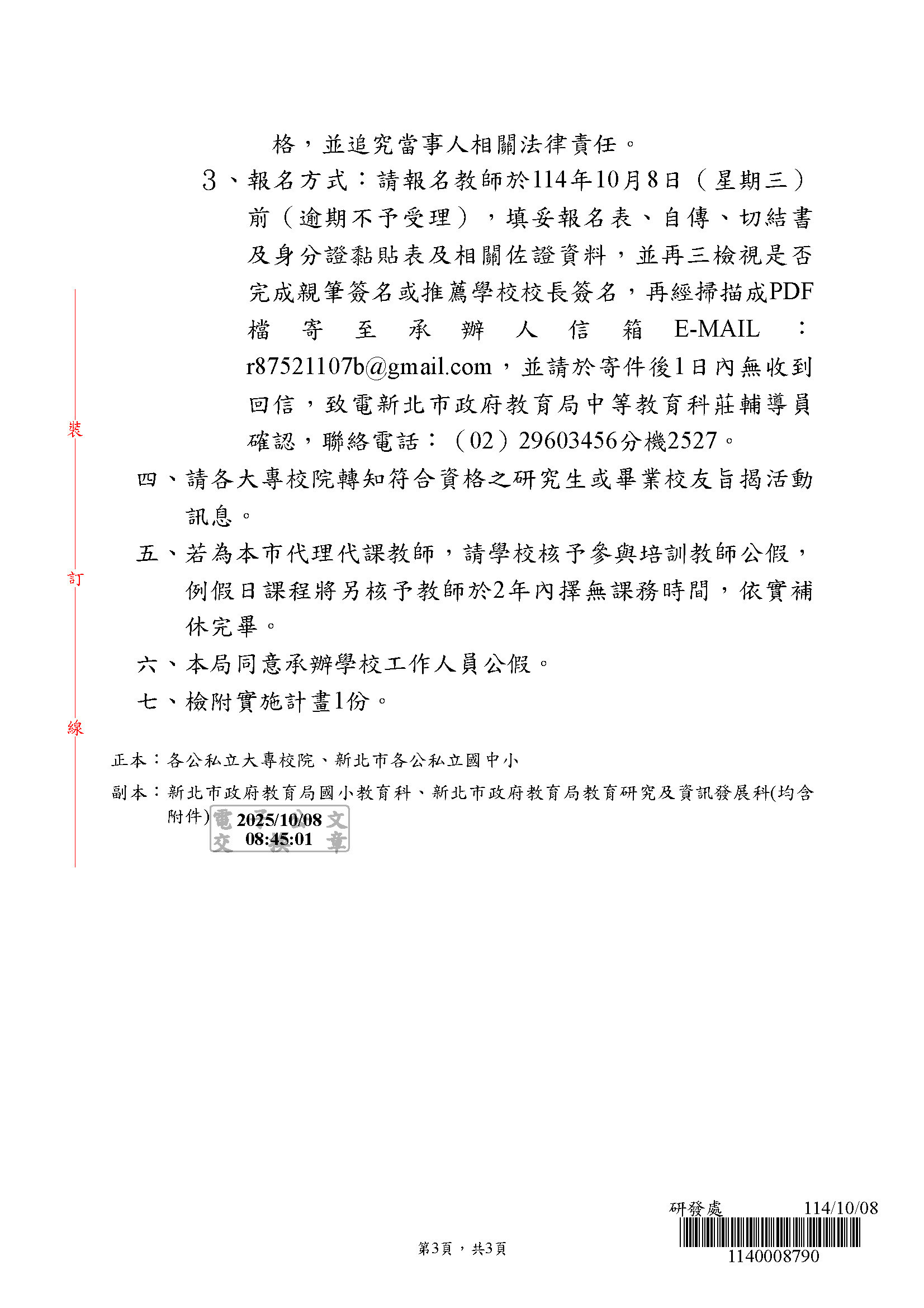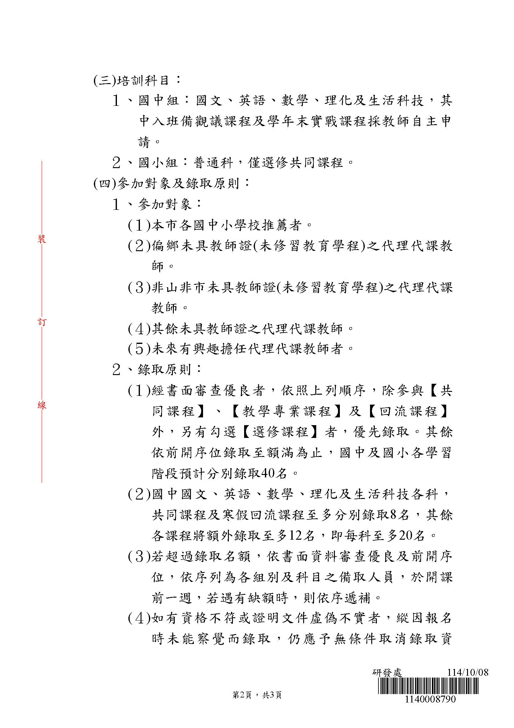 【新北市政府教育局】公告其有關「新北市114學年度國民中小學未具教師證之代理代課教師教學專業培育工作坊」相關訊息。