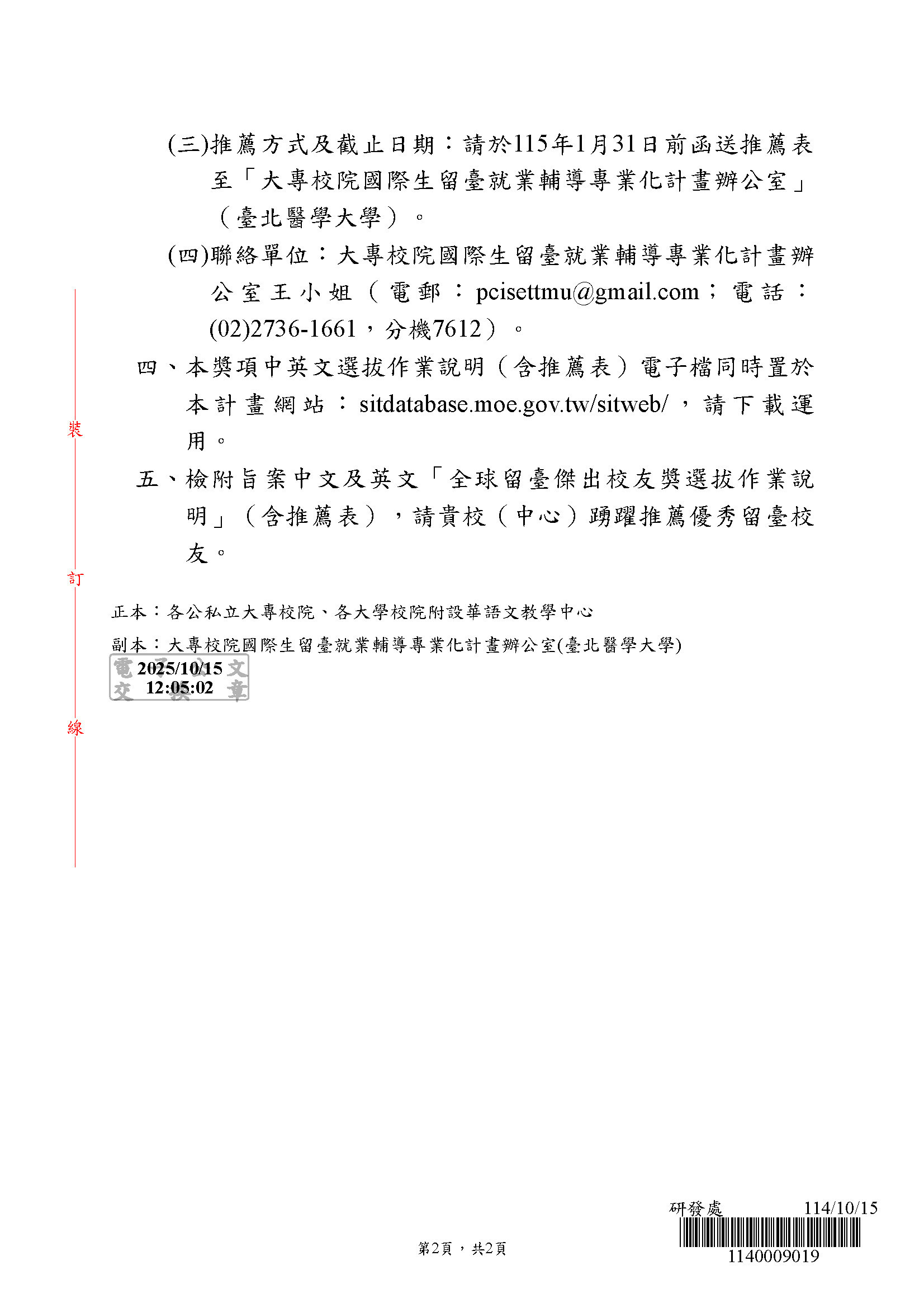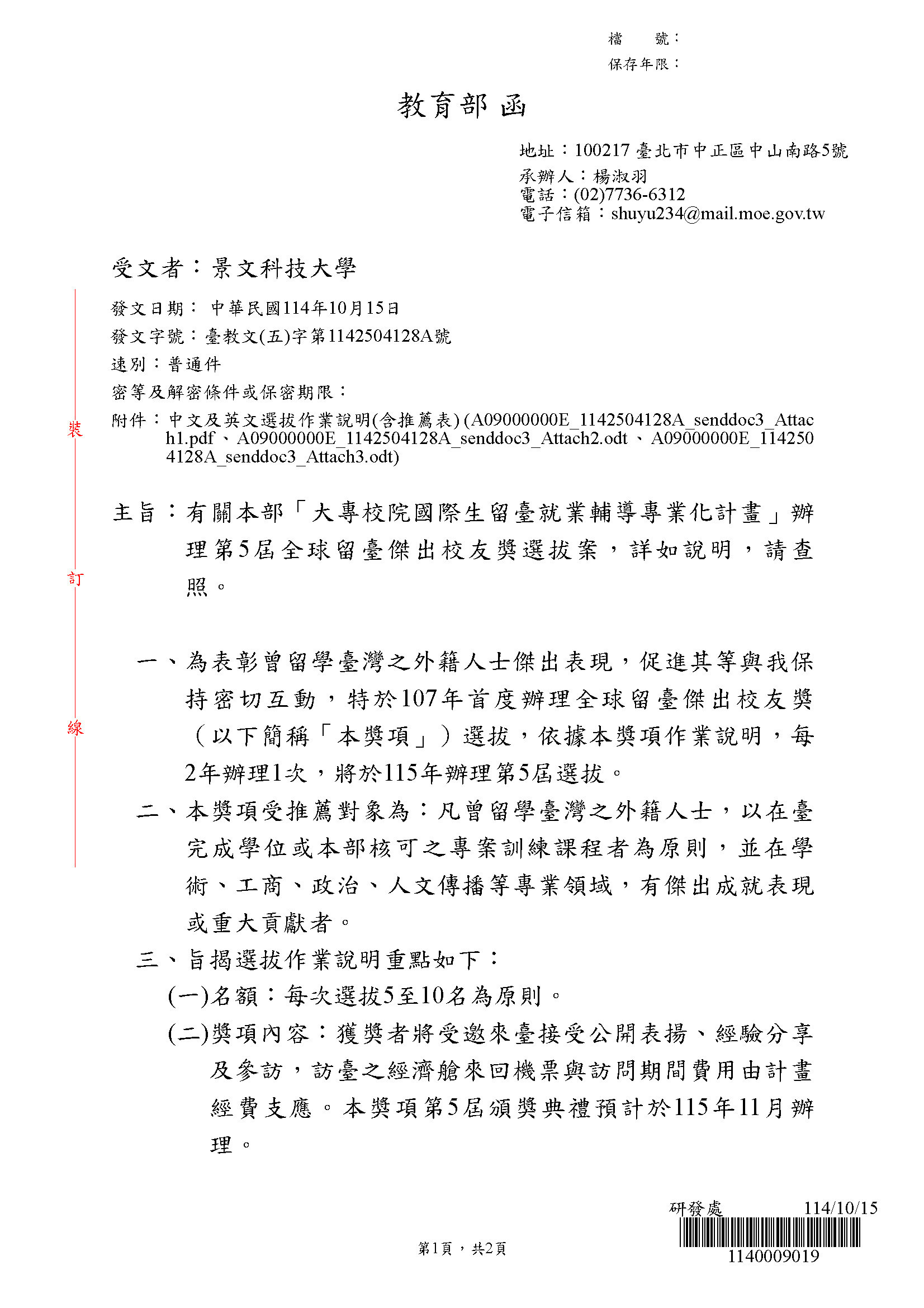 一、依據教育部114年10月15日臺教文(五)字第1142504128A號來函辦理。 ![]() ![]() 瀏覽數