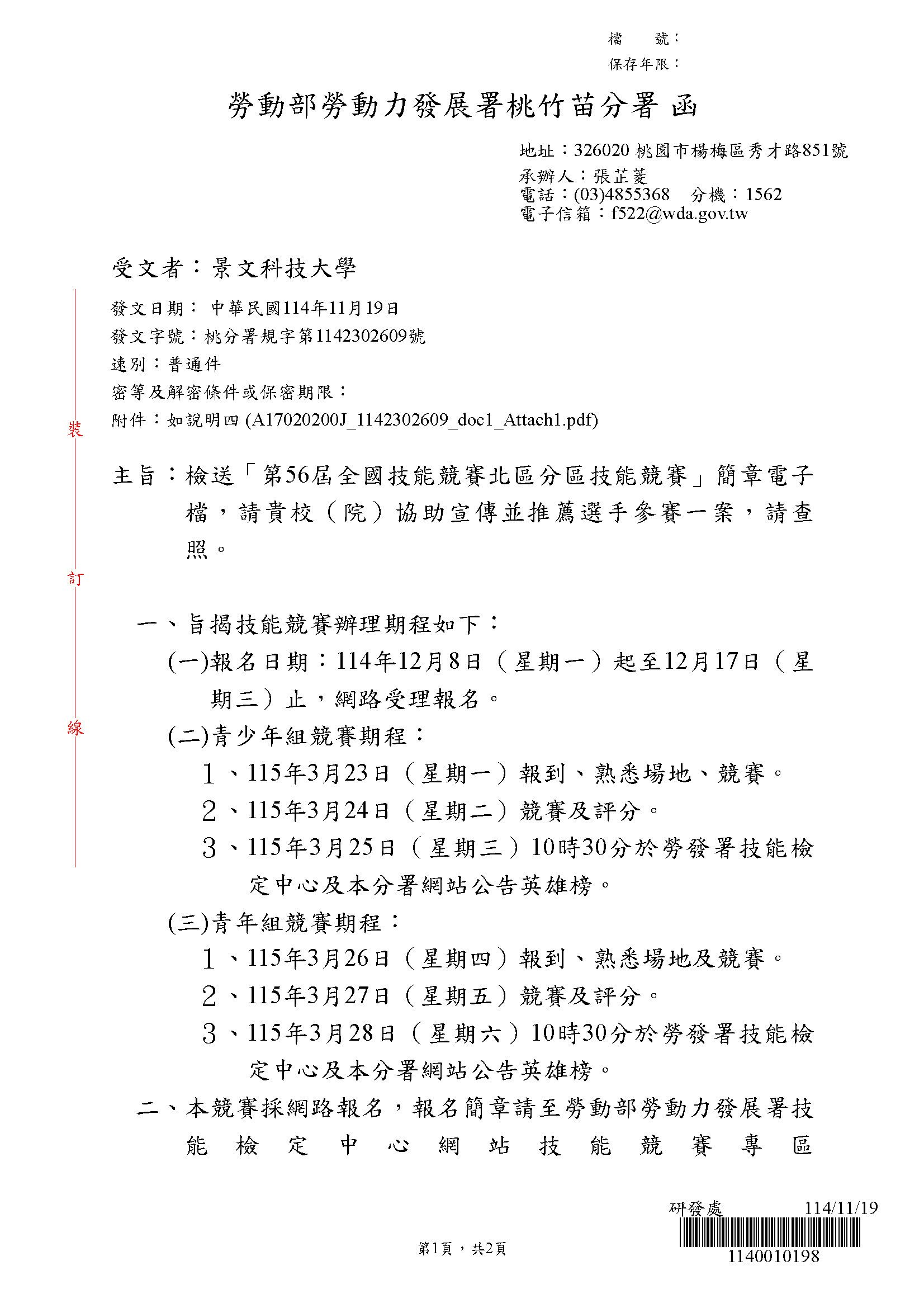 一、依據勞動部勞動力發展署桃竹苗分署114年11月19日(桃分署規字第1142302609號)來函辦理。