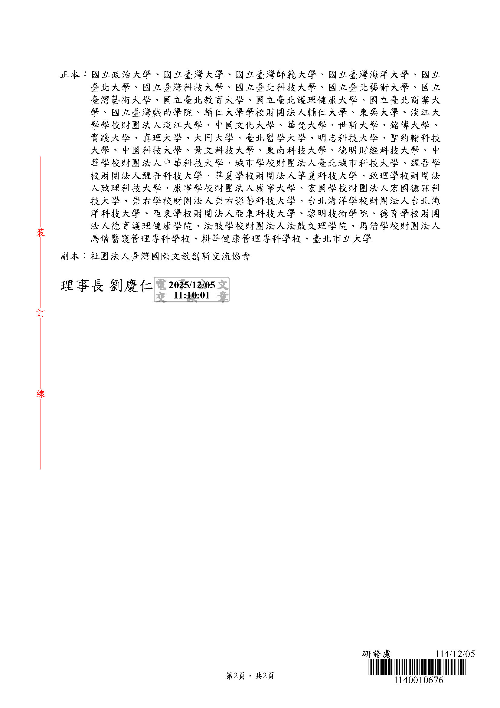 一、依據社團法人臺灣國際文教創新交流協會114年12月5日(臺國文教字第1140000056號)來函辦理。