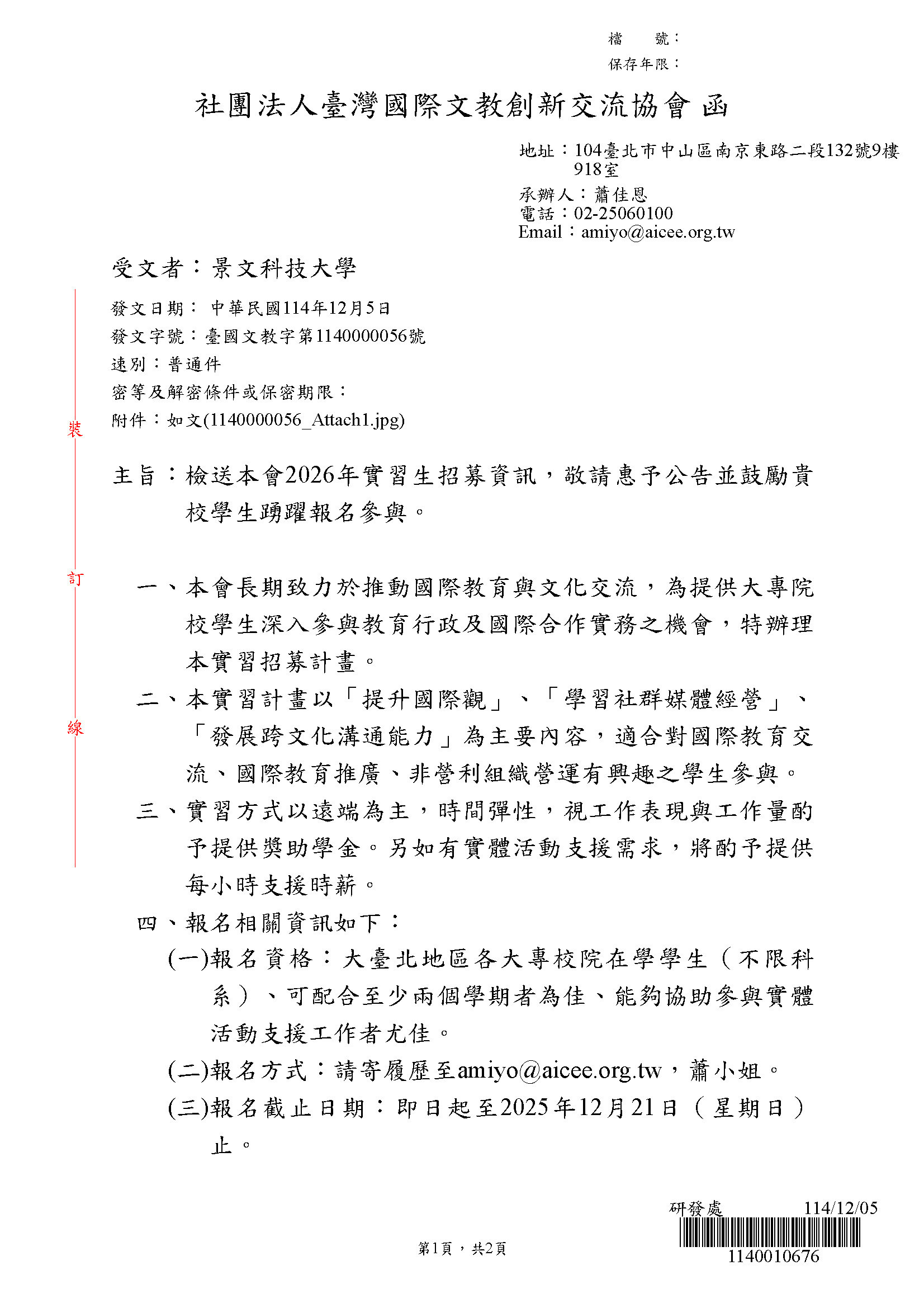 【社團法人臺灣國際文教創新交流協會】公告其2026年實習生招募相關訊息。