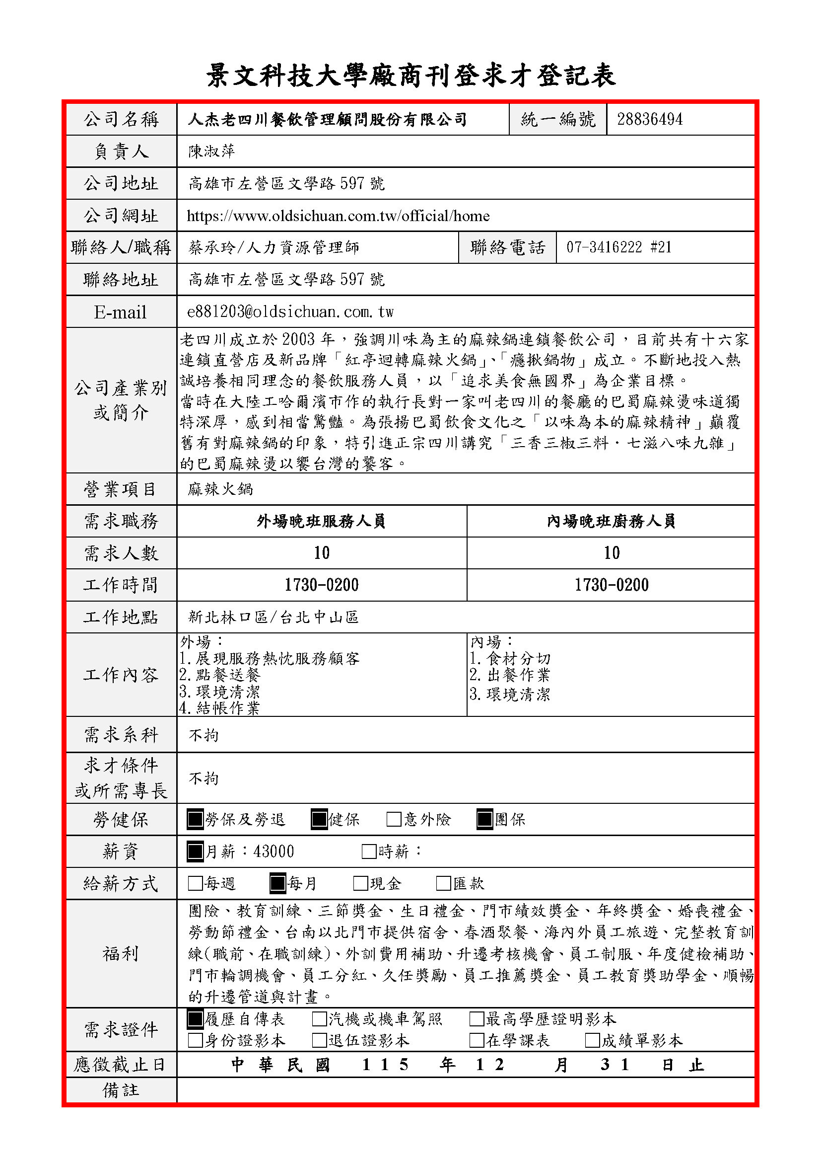 【人杰老四川餐飲管理顧問股份有限公司】徵-外場晚班服務人員、內場晚班廚務人員